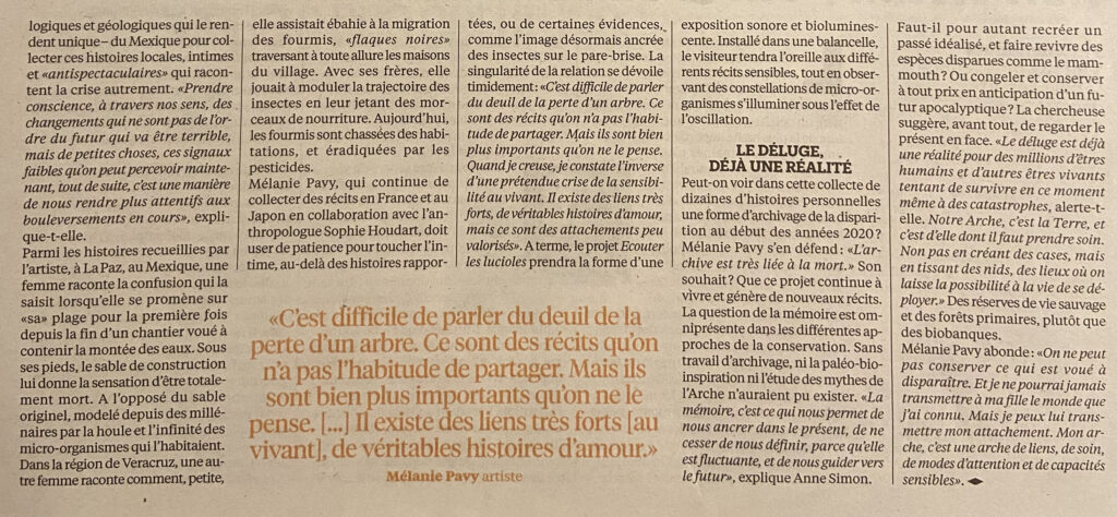 est un projet artistique de recherche, mené entre France, Japon et Mexique, qui associe les pratiques et les méthodes de l’anthropologie, de la biologie et de l’art visuel et sonore, afin de donner à percevoir les liens esthétiques et affectifs que nous entretenons avec le vivant et de nous interroger : l’attention que nous portons aux beautés de notre monde serait-elle capable de nous aider à le protéger de la crise en cours ?